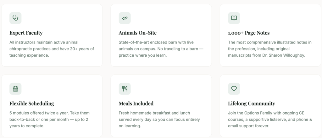 We’re not an office or a rented building — we’re a dedicated animal chiropractic college with everything you need under one roof.